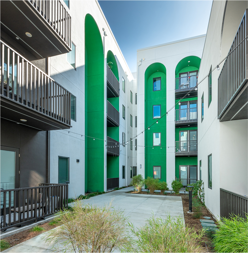 The project is located within an amenity rich community with transit routes on the adjacent east-west and north-corridors and nearby commercial amenities including a grocery store and other daily essentials. Ground floor spaces oriented along Westminster Boulevard include the main lobby, resident library, officers for property management and service providers, and community room, activating the adjacent pedestrian realm.