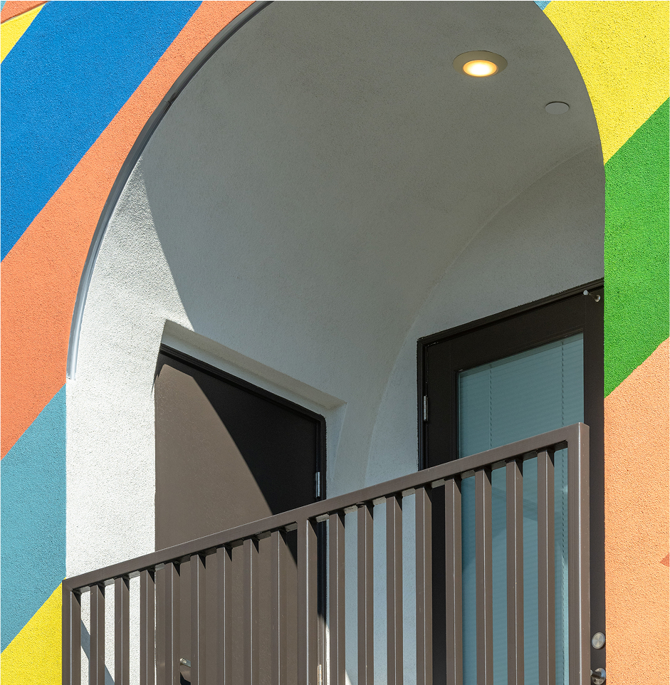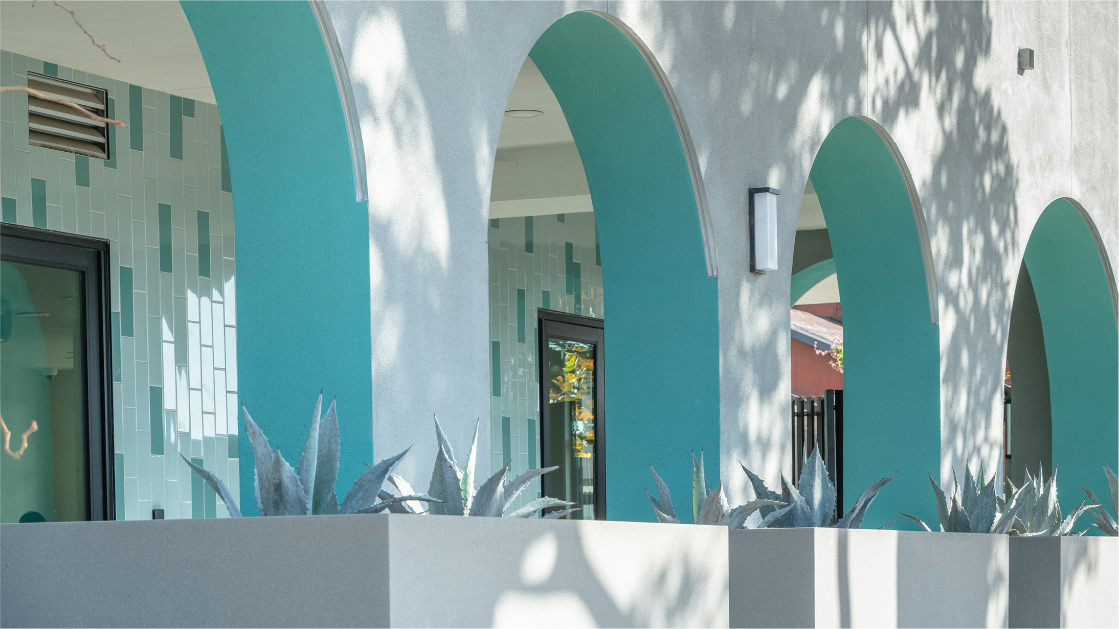 The community consists of three buildings that break down the scale of the multifamily property, all oriented along a pedestrian paseo that aligns with the adjacent commercial properties to the east and west. The four-story buildings taper down in height toward the south, transitioning to the single-family neighborhood. The buildings employ a playful use of plaster, color, and arches to engage the half dozen commercial and residential developments iterating on the Spanish-revival style throughout the 70’s, 80’s, and 90’s.